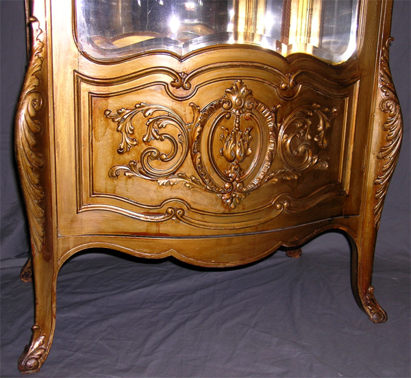 Circa 1890. Elegant, Louis XV style, gilded, Victorian china closet/ curio. This fine 19th century cabinet has everything! Very desirable size and shape, graceful proportions, and elegant detail. This lovely cabinet features a single, curved door with the original shaped, beveled glass, brass hardware and working lock and key. The sides of the curio also retain its original beveled glass. Beneath the glass on all three sides are panels with beautifully carved, raised decorative designs in gesso. The legs are slightly curved with an acanthus leaf detail, which also runs up the curved extended knees of the cabinet. The entire cabinet is gilded, the gilding on the interior is untouched original bright gold. On the exterior the finish has amber shellac, to preserve the original surface. Original mirrored back on the entire visible top section, which is finished with gilded rope. There are three original glass shelves, one of which has a small chip and an original wooden back. Over-all very good condition, displays beautifully. 31" widest x 67" tall x 17 1/4" deepest. Price $2,900.00