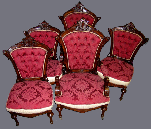 Circa 1875. Superb set of five Renaissance Revival parlor chairs. Fresh from a fine Brooklyn brownstone that has graced the cover of Victorian Homes Magazine and been featured in several house tours, this pristine set has two large armchairs and three large side chairs. Expensively re-upholstered in their original style with button tufted backs and shirred two tone seats, around twenty years ago, beautifully detailed American black walnut and burl in fine original finish. No missing, broken or repaired wood. We have cleaned and polished the original finish so the patina is warm and rich. The upholstery has some wear but over-all shows beautifully. Extremely comfortable and high style, this rare and lovely set would grace any setting. Arm chairs 43 1/2" tall x 27" wide x 32" deep, side chairs 40" tall x 21" wide x 25" deep. Price for the set of five $4800.00