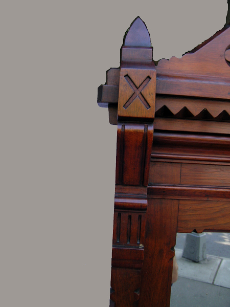 Circa 1880. Important, American black walnut dressing case, which we strongly believe to be by the 19th c master designer-craftsman, Isaac E. Scott (1845-1920). Scott gained fame for his work as seen in the John J. Glessner house in Chicago. His furniture was also on display in the Chicago Exposition of 1893. This chest is a fine example of his late Victorian "eclectic medievalism", which was influenced by the work of the English designers Charles Eastlake and Christopher Dresser, which incorporate their "five principals of design". Solid Walnut, inset with signed "Minton China Works, Stoke On Trent" tiles and brown marble. The key holes, locks and castors are all original, we believe the drop pulls are old replacements. Very fine original finish and original flat mirror. The dressing case is 54 3/4" wide x 23" deep x 85 1/4" tall. Price $4,500.00
