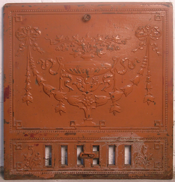Late Victorian cast iron fireplace insert "summer cover" Circa 1895. Beautifully cast scene of Classical motifs, including an urn, beading, floral wreaths and Greek Key corner detail. All original, from a local Brooklyn brownstone, never re-painted. Full marked on the reverse, W. L. Sharp & Son 1895. Very good condition, no damage we have cleaned it and it is ready to be re-painted if wanted. 25" tall x 22" wide. Price $250.00