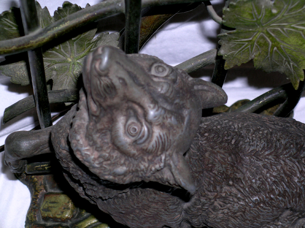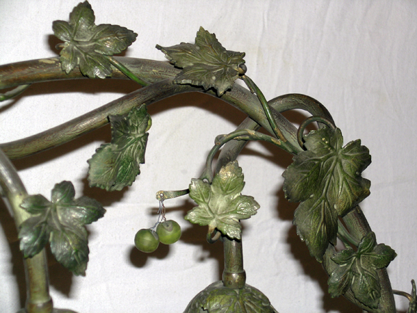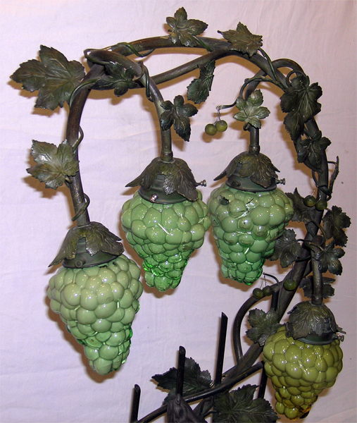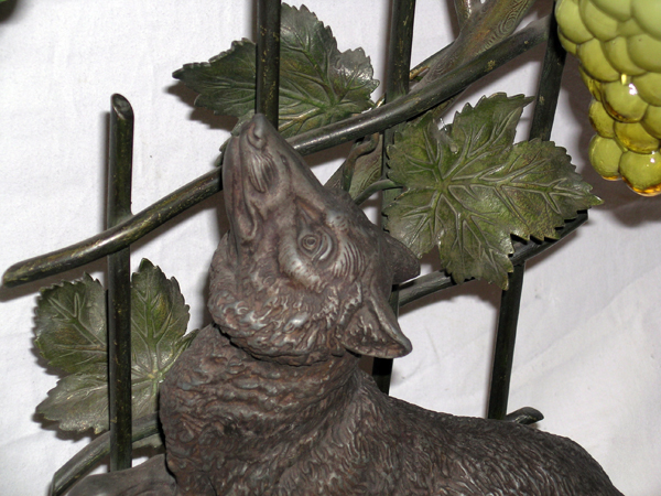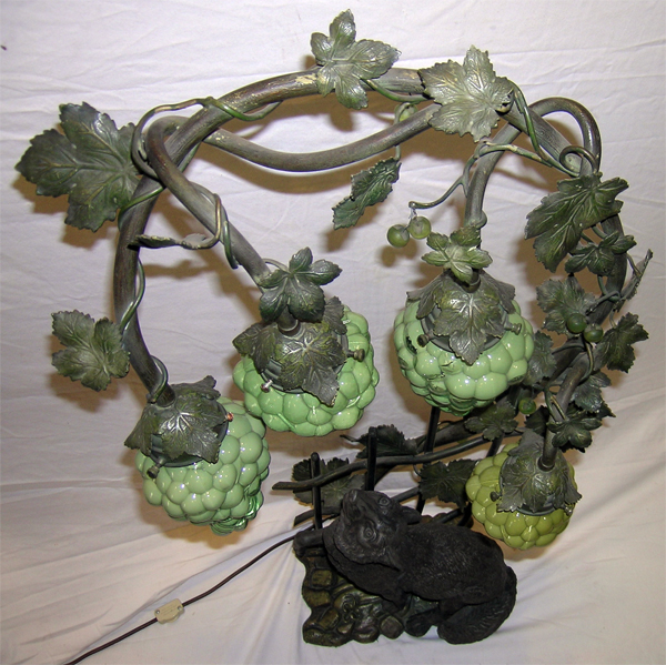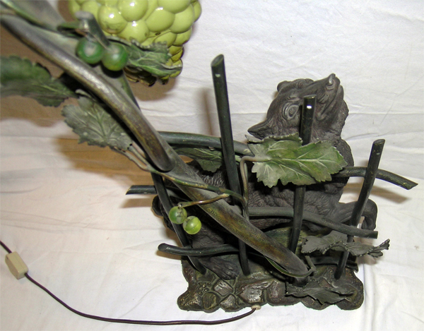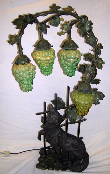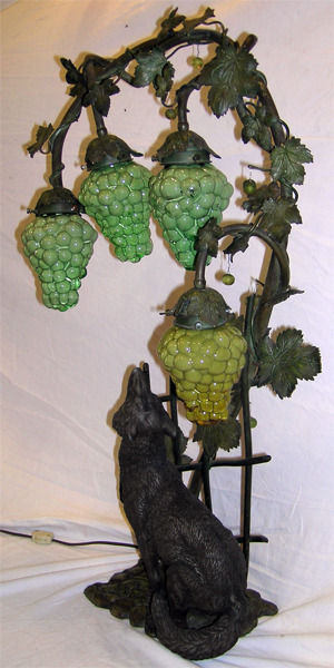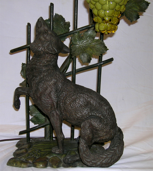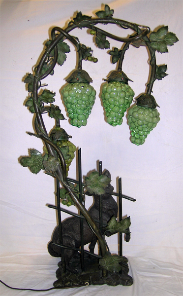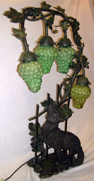 Extremely rare, Patinated white metal, allegorical lamp "The Fox And The Grapes." Circa 1900-1920. This amazing piece features a detailed, realistic fox, looking up at bunches of grapes hanging on a vine. The clusters of grapes are four cased glass shades in different shades of green to make them more realistic. There are also grape leaves wrapped around the vine and small bunches of hanging glass grapes. The base of the lamp where the fox is standing is cast to look like scattered leaves. All original un-repaired condition, with a lovely near perfect bronzed finish. 36" tall x 20" wide x 11" deep. A rare beauty. Price $5,800.