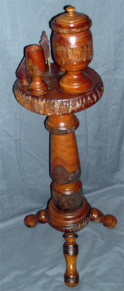 Circa 1890-1910. Rare, rustic smoking stand in the Adirondack Style. Unusual for all it's detail, this stand is definitely a cut above the crowd, with a covered humidor for cigars or cigarettes, an ashtray, a match holder and striking plate, all surrounding a figure of a moose! The body of the stand is beautifully figured, turned wood, with three turned legs, all with the rich patina and glow that is only achieved over the passage of time. The statue of the moose is white metal that has been painted brown with a red mouth and darker brown eyes and hooves. The body of the moose looks as if it has had some touch up painting in the past. Over-all excellent condition and finish, a real prize for an Adirondack or rustic furniture collector. 38" tall x 11" diameter. Price $1200.00