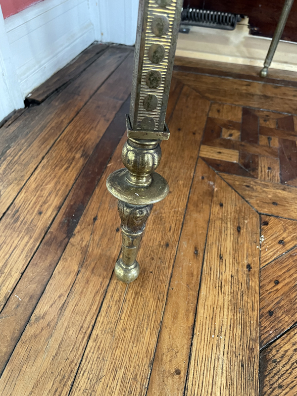 EXTRAORDINARY 19TH CENTURY AESTHETIC MOVEMENT BRASS EASEL. Fresh from a private home, we are thrilled to offer the finest, most elaborate American Aesthetic Movement, full size, adjustable display easel we have ever encountered. Solid cast brass, with virtually every surface cast with very fine Period details. The top section features a large bird on a branch with leaves, flowers and fruit. The lower frieze has a seated cherub drawing a picture of a seated headless model. The scene also includes an easel and scattered flowers and artist implements. The flower and fruit motif is continued on either side of the lower frieze and is bracketed by large flower and leaf knobs that support the paintings being displayed. The easel is "as found" with a subtle patina, mostly still a bright brass with some darker spots expected in a piece this old. This exceptional piece of Victoriana is fully adjustable and very sturdy. It can be adjusted to display any art that is between 12-48 inches high. The easel stands an impressive 72 inches tall and 23 inches at the widest point. Very good original condition, it would be afine addition to any Aesthetic Movement collection or for anyone who wants to own an exceptional piece of 19th c decor. Circa 1885-95. Price $2400.00