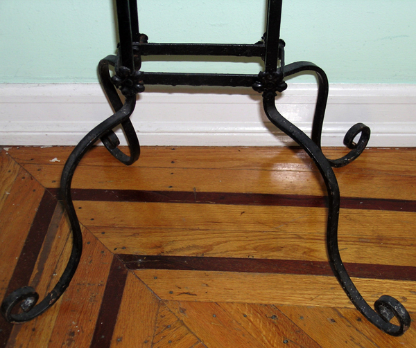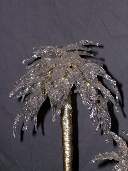 Circa 1930. Palm tree decorative centerpiece in glass and wire. One of a kind, two piece centerpiece made of glass leaves, metallic thread and wire. Each leaf can be moved to change the look slightly. The leaves are cast glass with veins and the base is cast free form. All the glass sparkles as does the metallic thread that wraps the wire. All together it makes a great look, light hearted and dramatic. Very good original condition. 14" tall x 10" wide x 3" tall x 4 1/2" base. Price $595.00