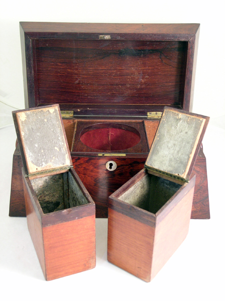 19TH CENTURY. Regency Rosewood Tea Caddy. As fine and elegant as they come, fresh from a fine home in upstate New York, this casket style tea caddy features two inserted, hinged boxes which flank a circular center, which I believe was made to hold a bowl. The key hole is mother of pearl, the side knobs are turned rosewood and all the hinges are the original brass. Old felt lining on the bottom. Fine original condition throughout. 13" long x 7" wide x 7" tall. Price $795.00