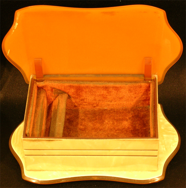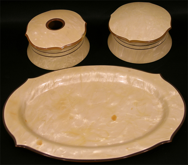 Celluloid Vanity Set Signed Circa 1920. This large, amazingly preserved vanity set is a pearlized celluloid and features a large elegant tray, large hand mirror (beveled) velvet lined, hinged jewel box, covered powder box, covered hair receiver and two additional covered boxes which are smaller and a small shoe horn. The set is in near mint condition with only a couple of small discolorations on the tray. Great collectable, ready to use. Price $100.00 for the set.