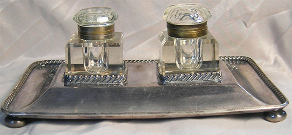 Early 20th century double inkwell by the renowned English maker, "Walker & Hall". Fine Sheffield silver-plate in good original, antique condition. This elegant desk-top item has two large crystal inkwells, one slightly larger than the other. The rope edged stand, features four, flattened ball feet and a slightly curved tray for pens. The larger inkwell appears to have had it's lid re-soldered in the distant past, which has not affected it's use or looks. 10.5" wide x 6.75" deep x 3.5" tall. Price $295.00