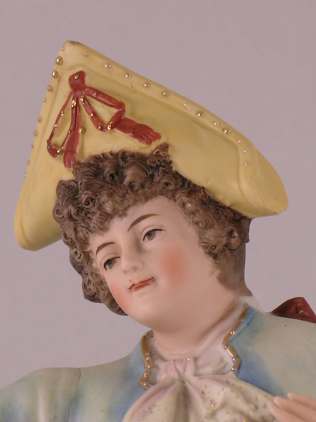 Circa 1890. Fine, tall French porcelain figure. Un-marked and yet very well done and detailed. This is a statue of a young man in elaborate costume, from his red shoes and white hose to his ruffled shirt and floral waistcoat with gold buttons and pointy hat. Beautifully hand-painted and in very fine original condition, with only minor wear to the gold detail at the point of his hat. Fresh from a local Brooklyn estate. 15" tall x 7 1/2" wide x 5" deep. Price $395.00