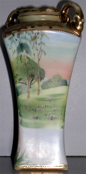 Hand-painted Nippon Scenic Vase. Lovely, all original antique Nippon double handled vase. Delicate detail and fine raised gilding add to the charm of this vase. Very good original condition with some wear to the gilding on the handles, no chips, cracks or repairs. Four gently curved sides, narrowing at the base, all painted by a skilled hand .Fully marked on the base. 6" tall x 3" wide. Price $85.00.