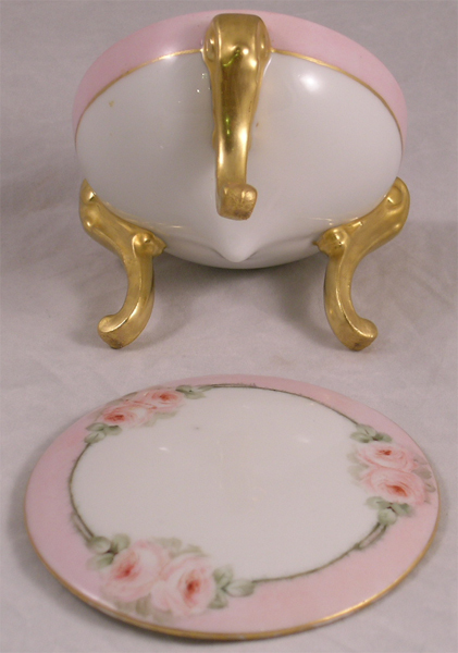 Circa 1890. Dainty hand painted round covered dish. This small fine bowl is white and pink with gilded accents and pink rose decorated lid. The long, curvy legs are heavily gilded and add a touch of elegance to this unusual piece of porcelain. Unmarked, probably French in origin. Fresh from a local Brooklyn estate. Good original condition with wear to the gilded rim of the cover. 4" diameter x 2 3/4" tall. Price $125.00